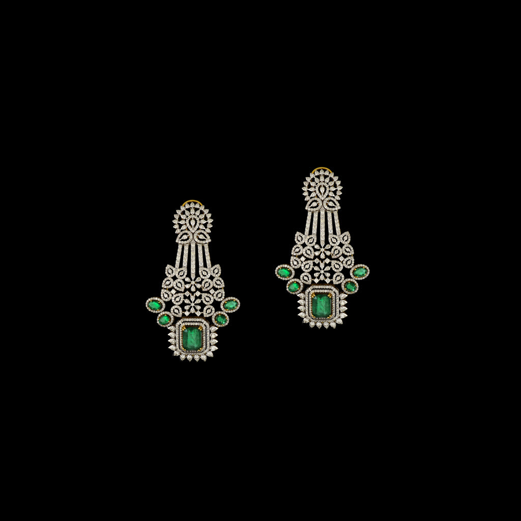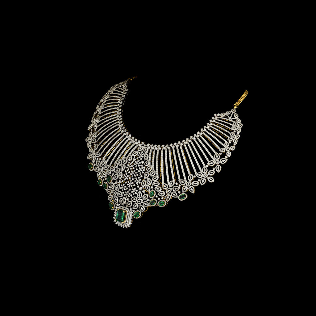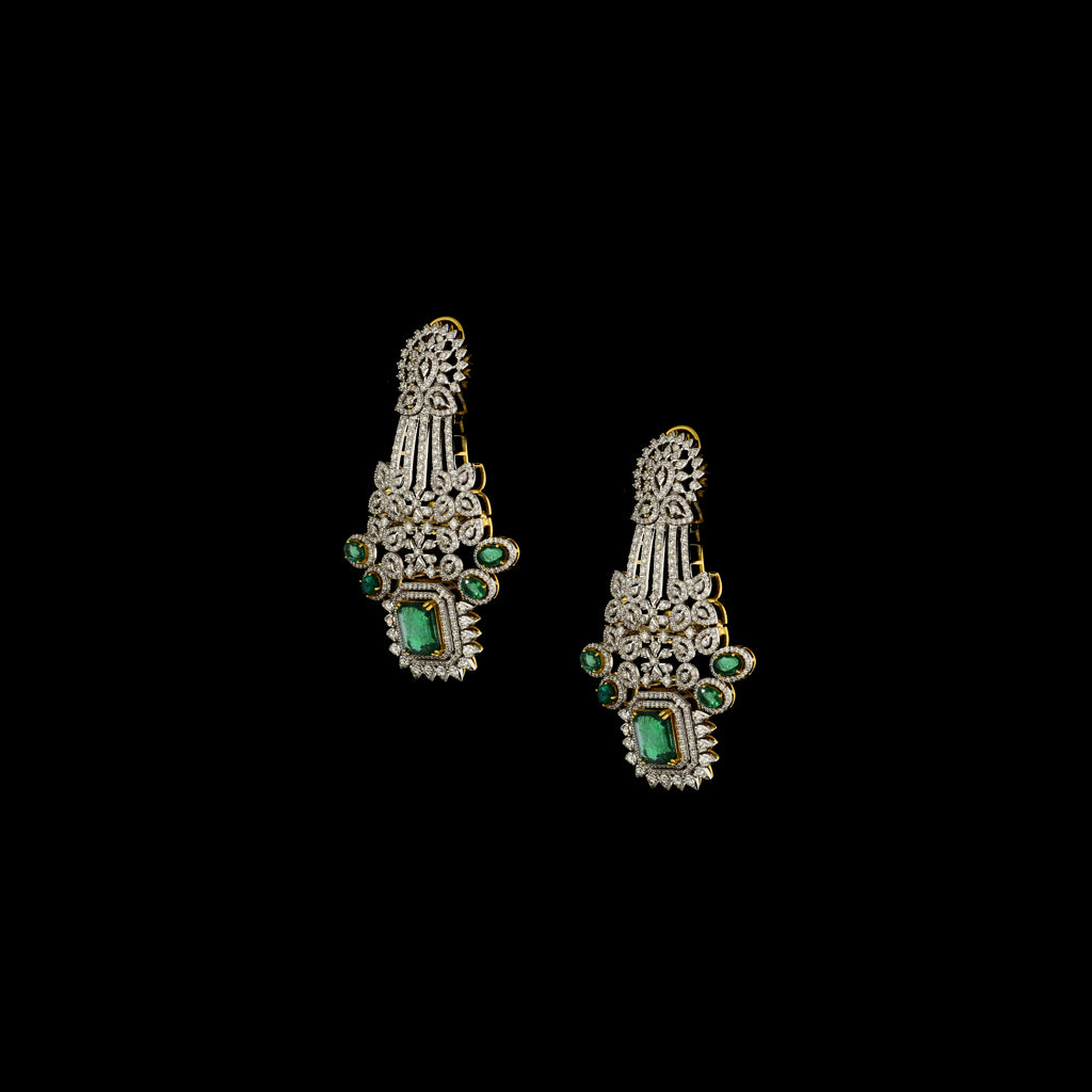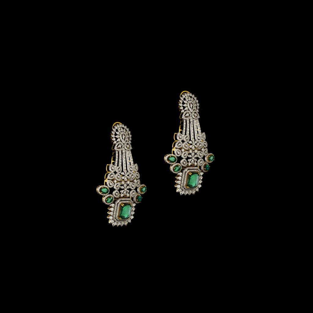 Exude timeless elegance with this stunning diamond and emerald necklace and earring set. A bold designer masterpiece, perfect for grand occasions.(GDNE0510)