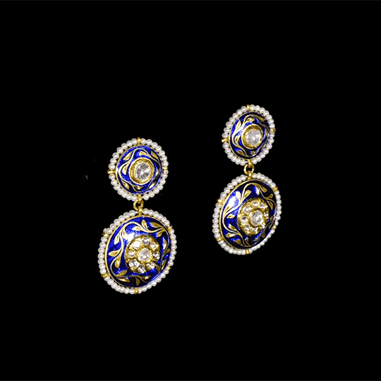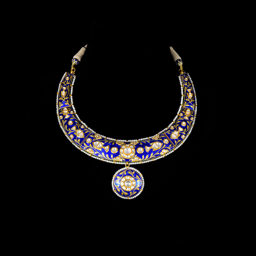 The Blue Meena Hasli Necklace and Earring Pair is a stunning jewelry set that is sure to make a statement. The necklace features a traditional hasli design that sits snugly around the neck. It is handcrafted using good quality diamond polki and adorned with beautiful blue meena work.