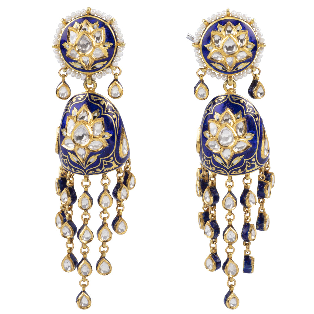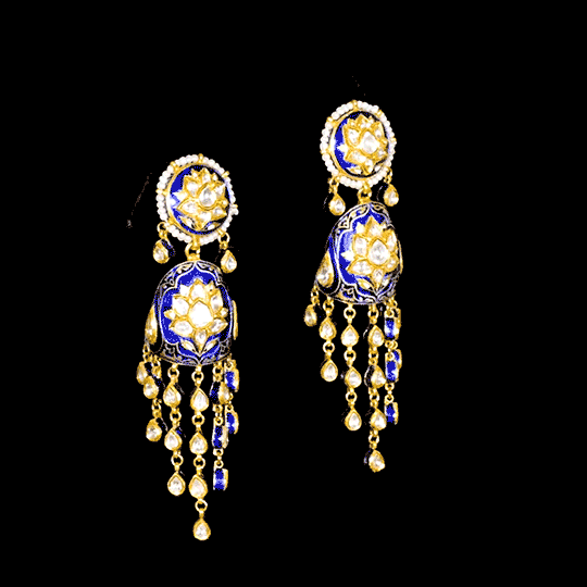 Necklace (hasli) and jhoomki pair in blue meena with 18k gold and uncut diamonds and pearls , it’s perfect for traditional Indian attire to modern western wear - KMNE2947