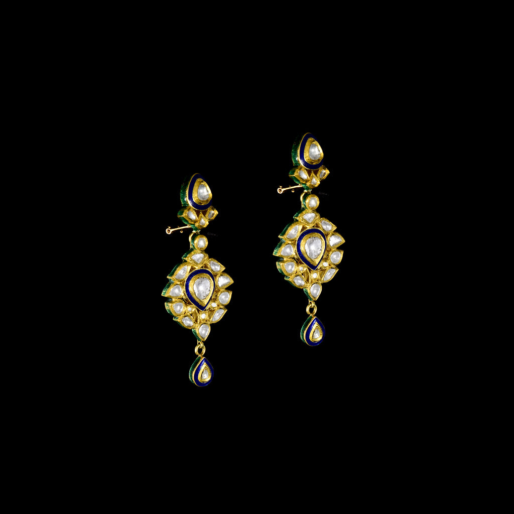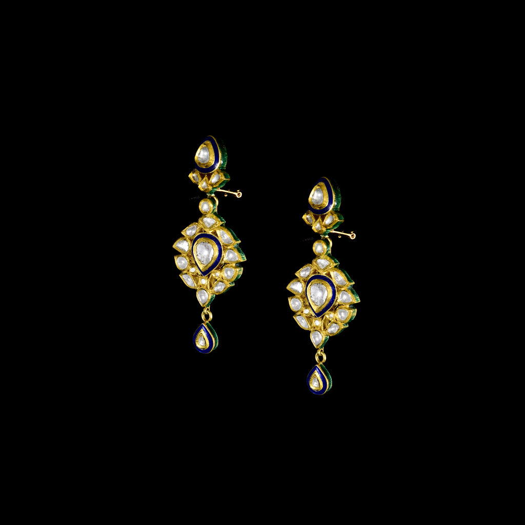 Elegant single-line necklace with matching earrings, featuring a delicate pendant, blue enameled detailing, and sparkling diamond Polki. A perfect fusion of tradition and style for graceful, standout occasions.(KMNE3466) + (kme2332)