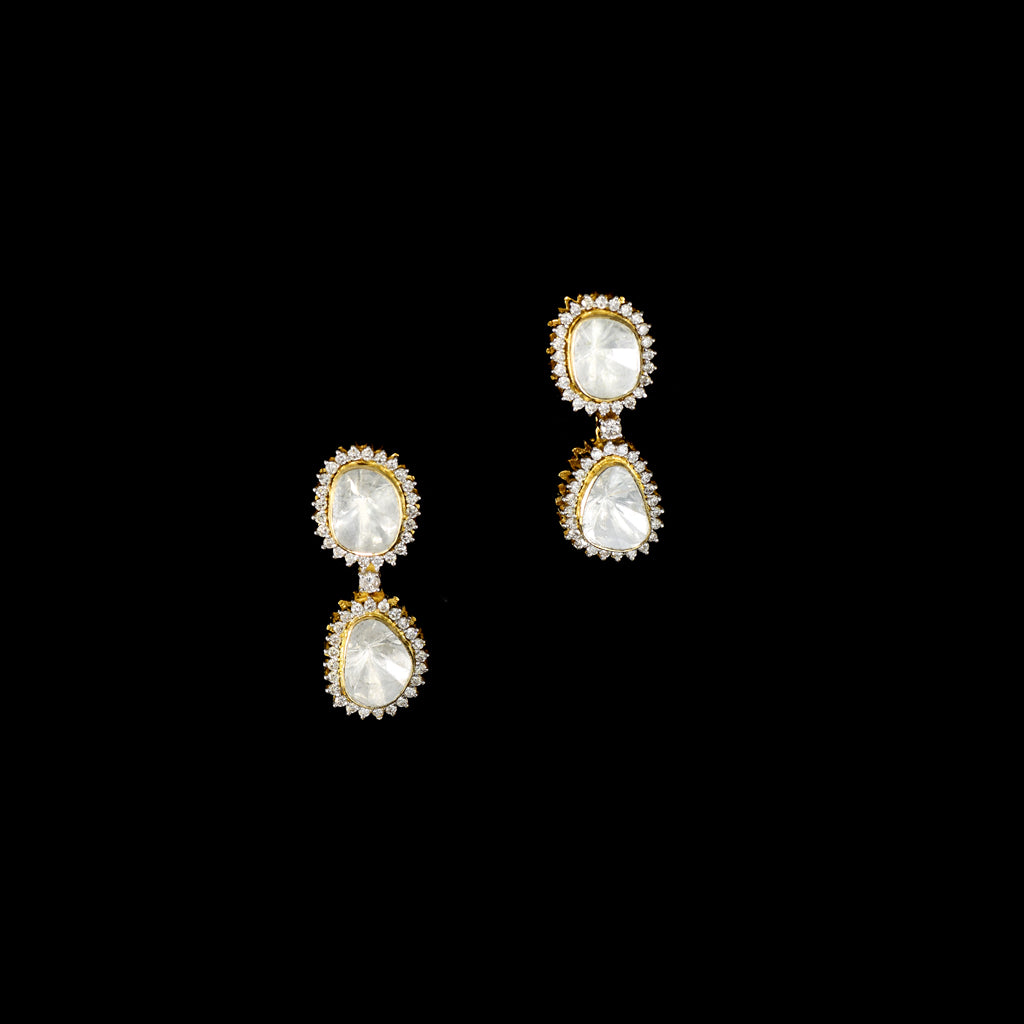 Elegant dangling earrings featuring a bold diamond Polki at the center, beautifully surrounded by sparkling round diamonds. A timeless design that adds graceful charm and brilliance to any special occasion.(KME2441)