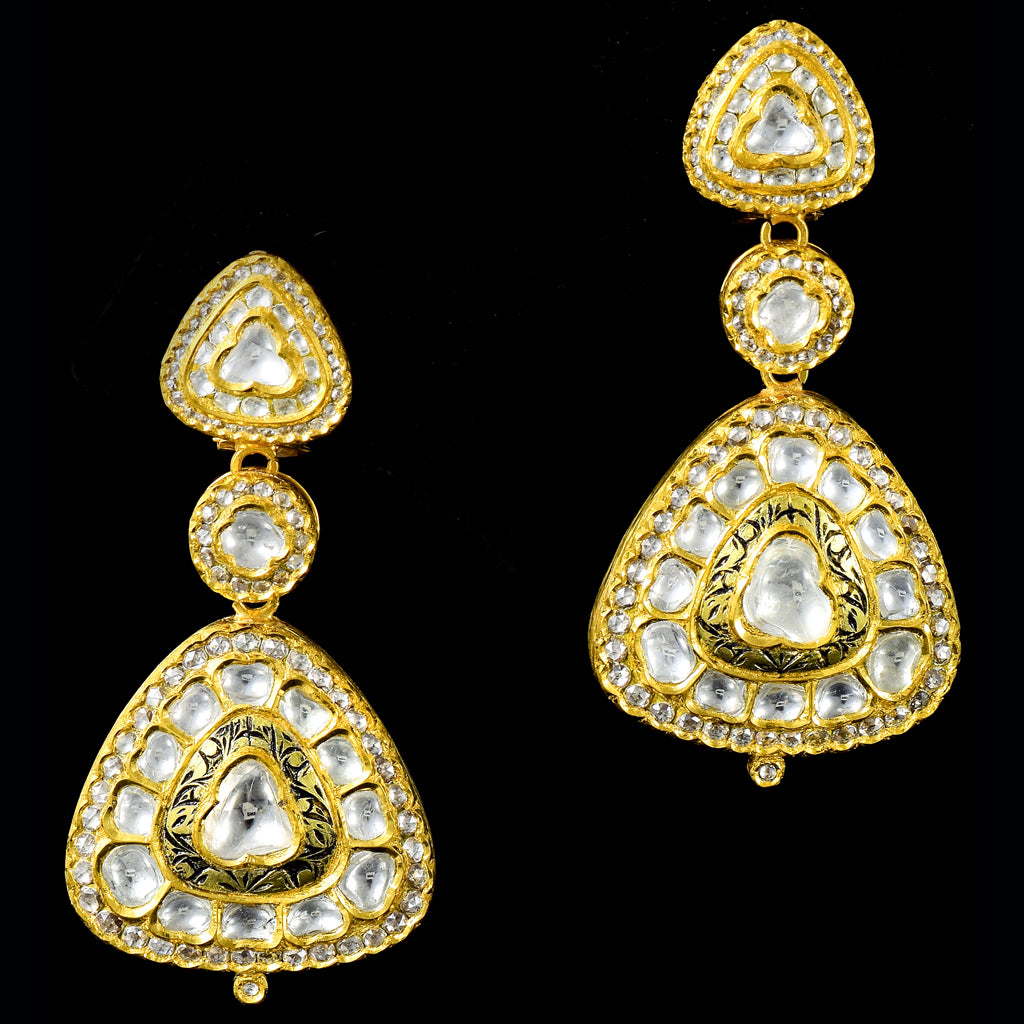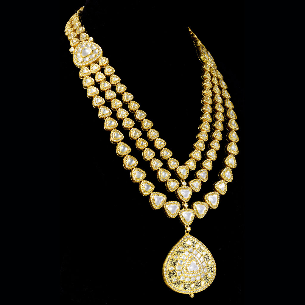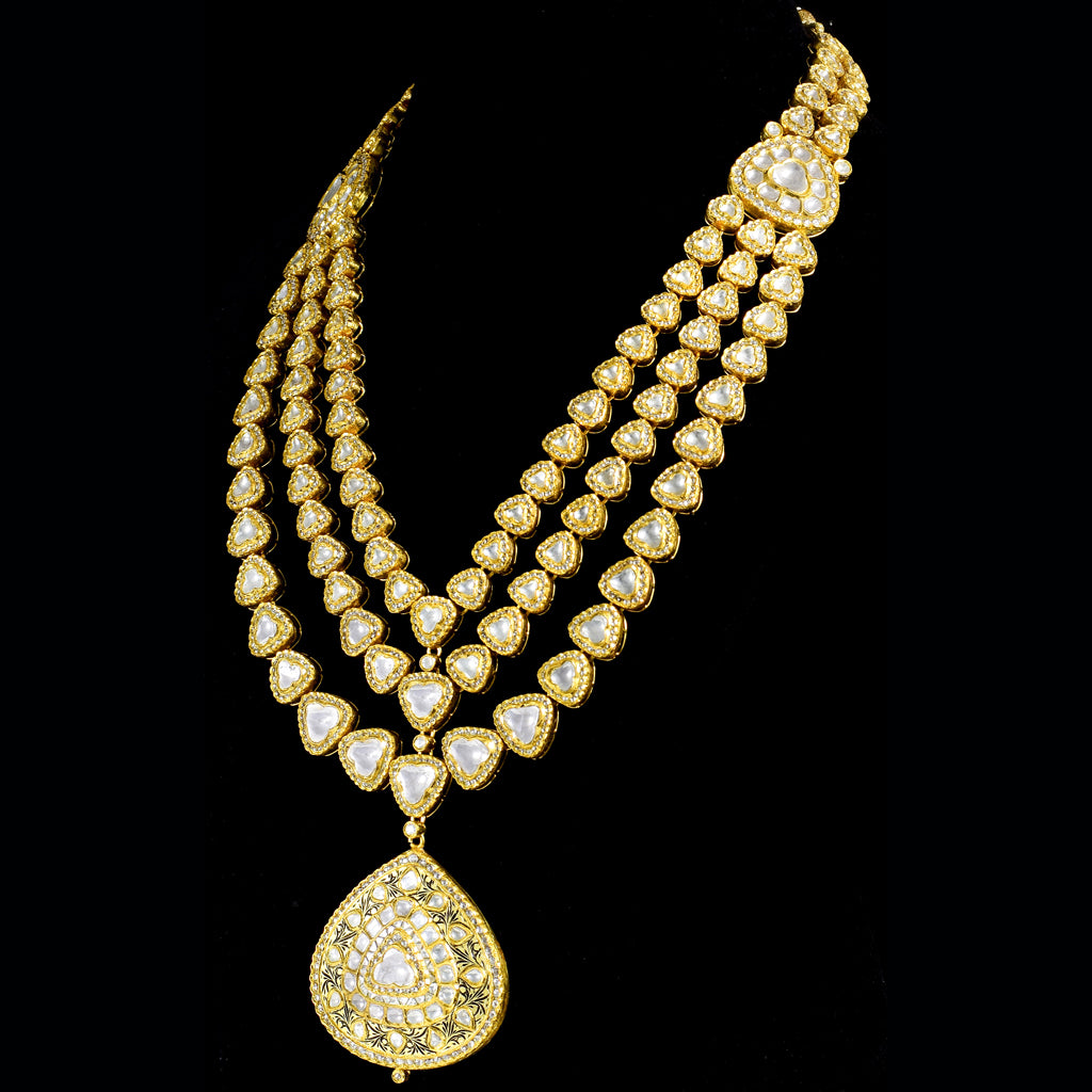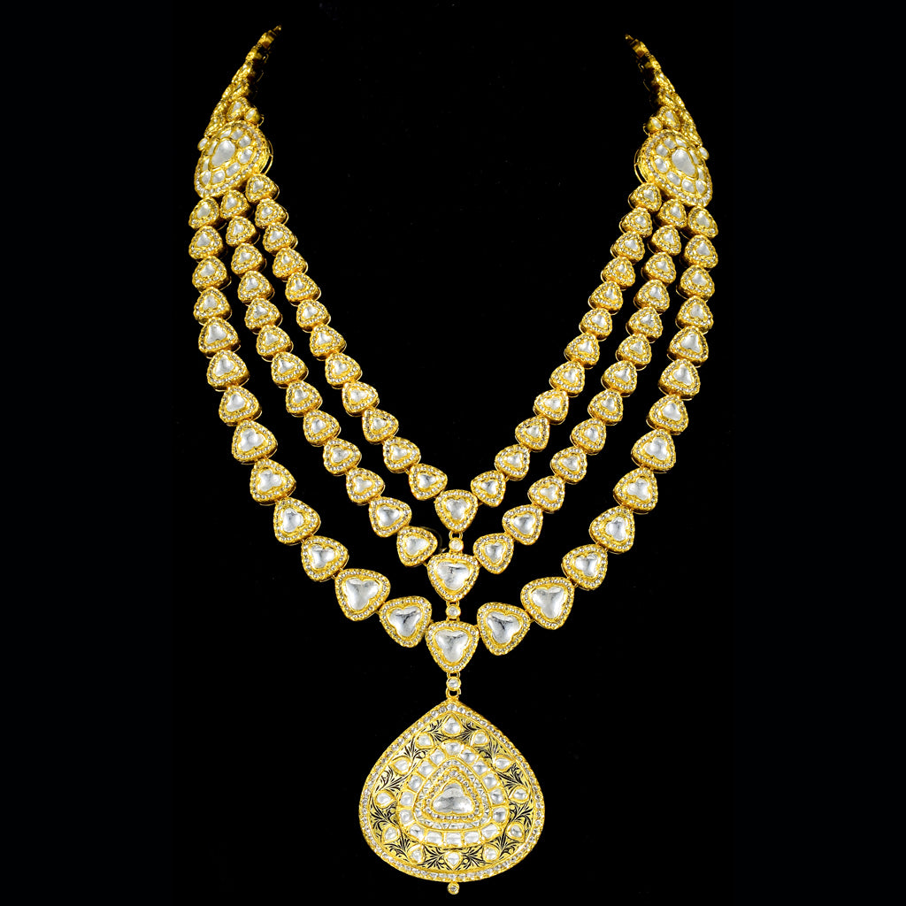 The 3 lines necklace and earring pair features a central uncut diamond, radiating natural elegance and raw beauty. Encircling this centerpiece are meticulously arranged rosecut diamonds, each delicately framing the uncut diamond with a shimmering halo. The design creates a captivating contrast between the rustic allure of the uncut diamond and the refined sparkle of the rosecut diamonds, making it a stunning statement of sophistication and grace.