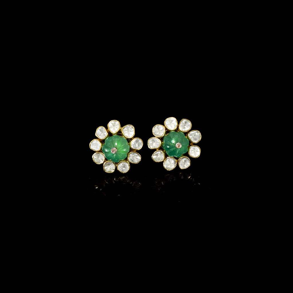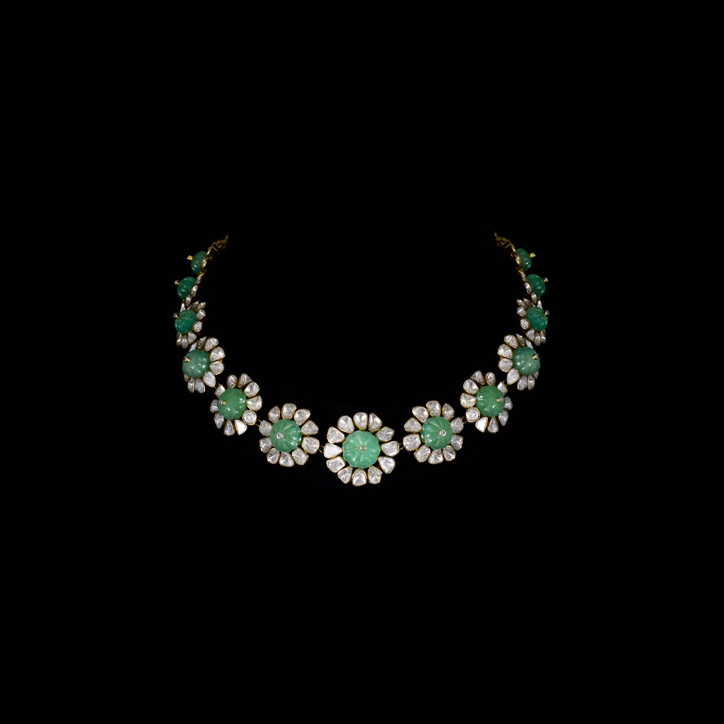 Discover refined elegance with this fusion-style necklace set, featuring a carved emerald centerpiece surrounded by uncut diamond Polki. A perfect harmony of tradition and modernity, crafted to make a statement.(KMNE3614)