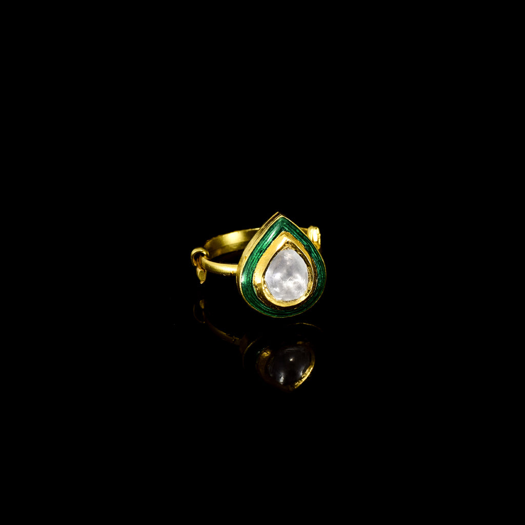 Elegant green pear-shaped Meena ring with sparkling diamond Polki, featuring an adjustable design for a perfect fit.(KMR0169)