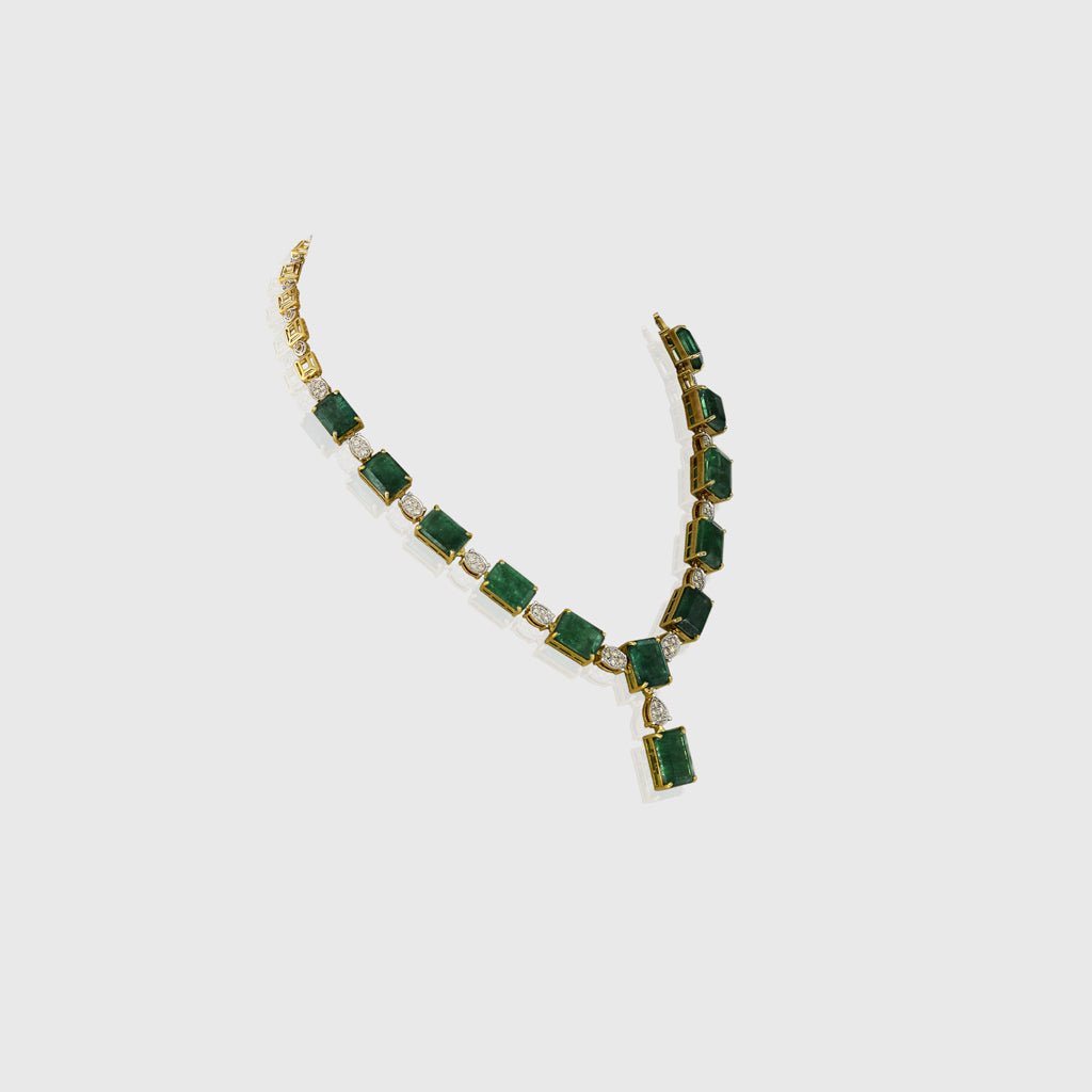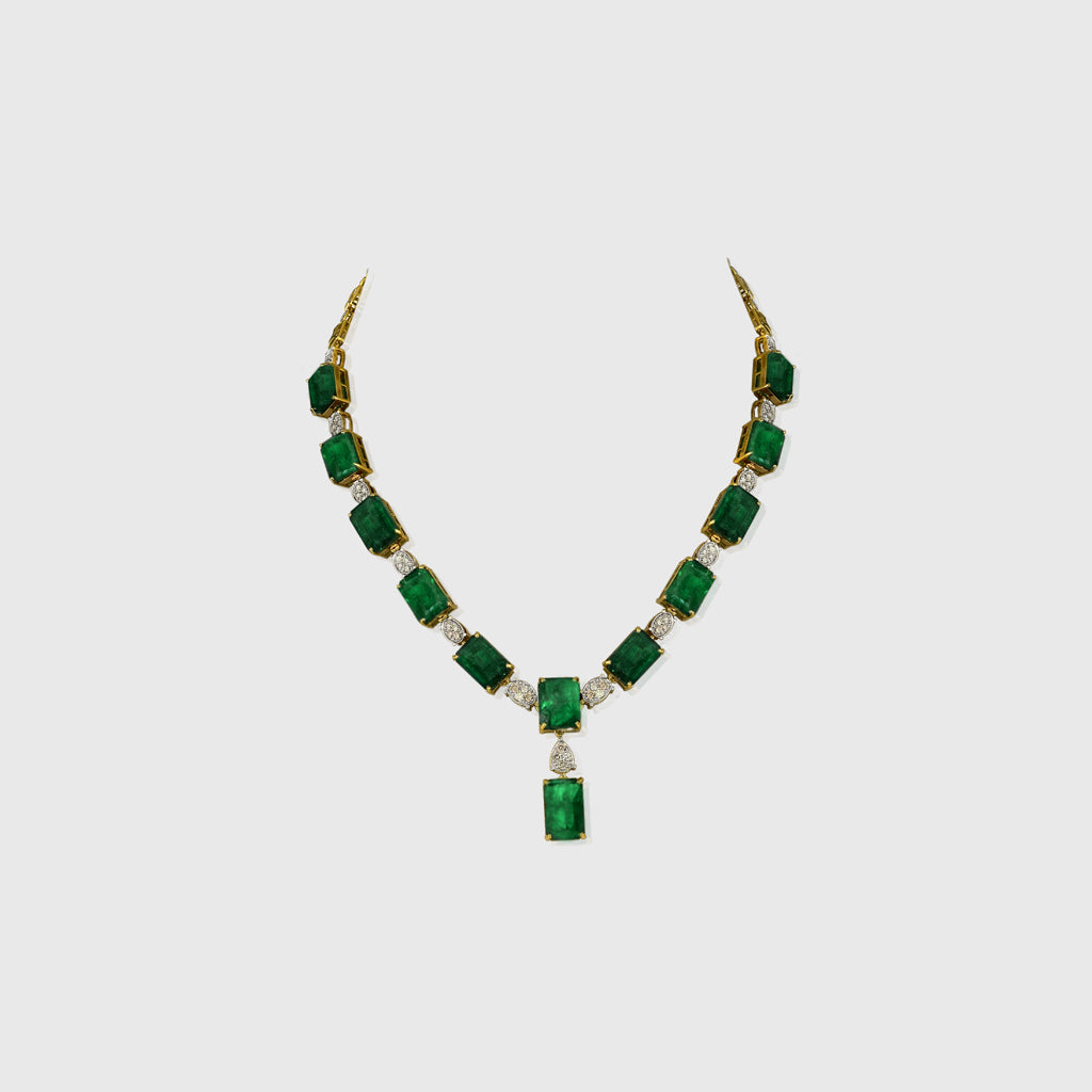 Exquisite necklace and earring pair featuring octagon-shaped emeralds accented with sparkling round diamonds—a perfect blend of luxury, elegance, and timeless beauty for any special occasion.(PGDNE0143)
