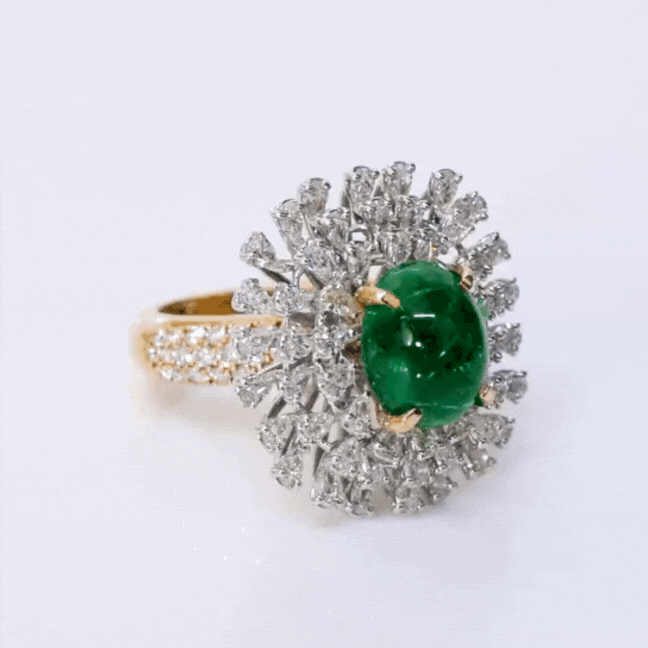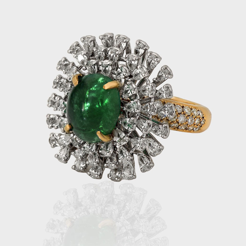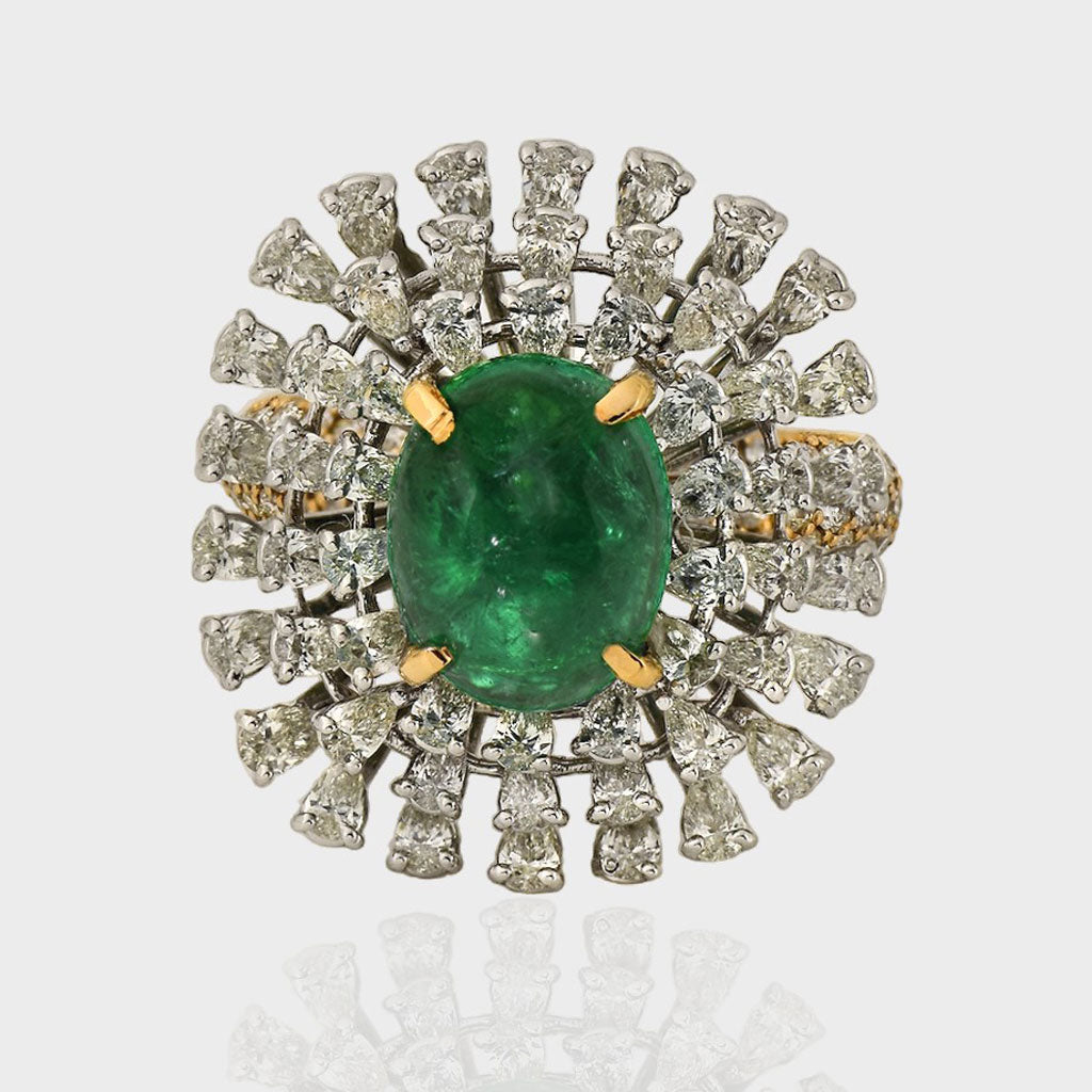 Experience unparalleled elegance with our Fine Quality Emerald Cabochons and Diamond Ring. Each exquisite detail is meticulously crafted to showcase the timeless allure of emeralds and the brilliant sparkle of diamonds.(PGDR0373)
