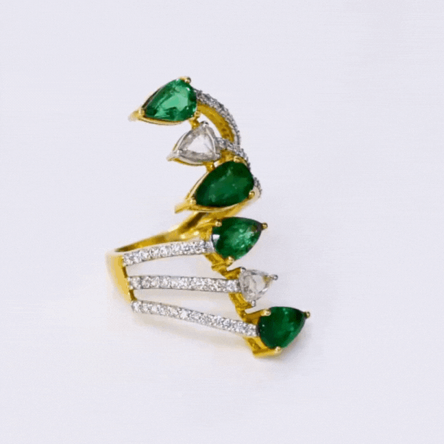 Stunning Ring adorned with a mesmerizing array of diamond rounds, rose-cut diamonds, and pear-shaped emeralds, a true embodiment of luxury and elegance.((PGDR0414)