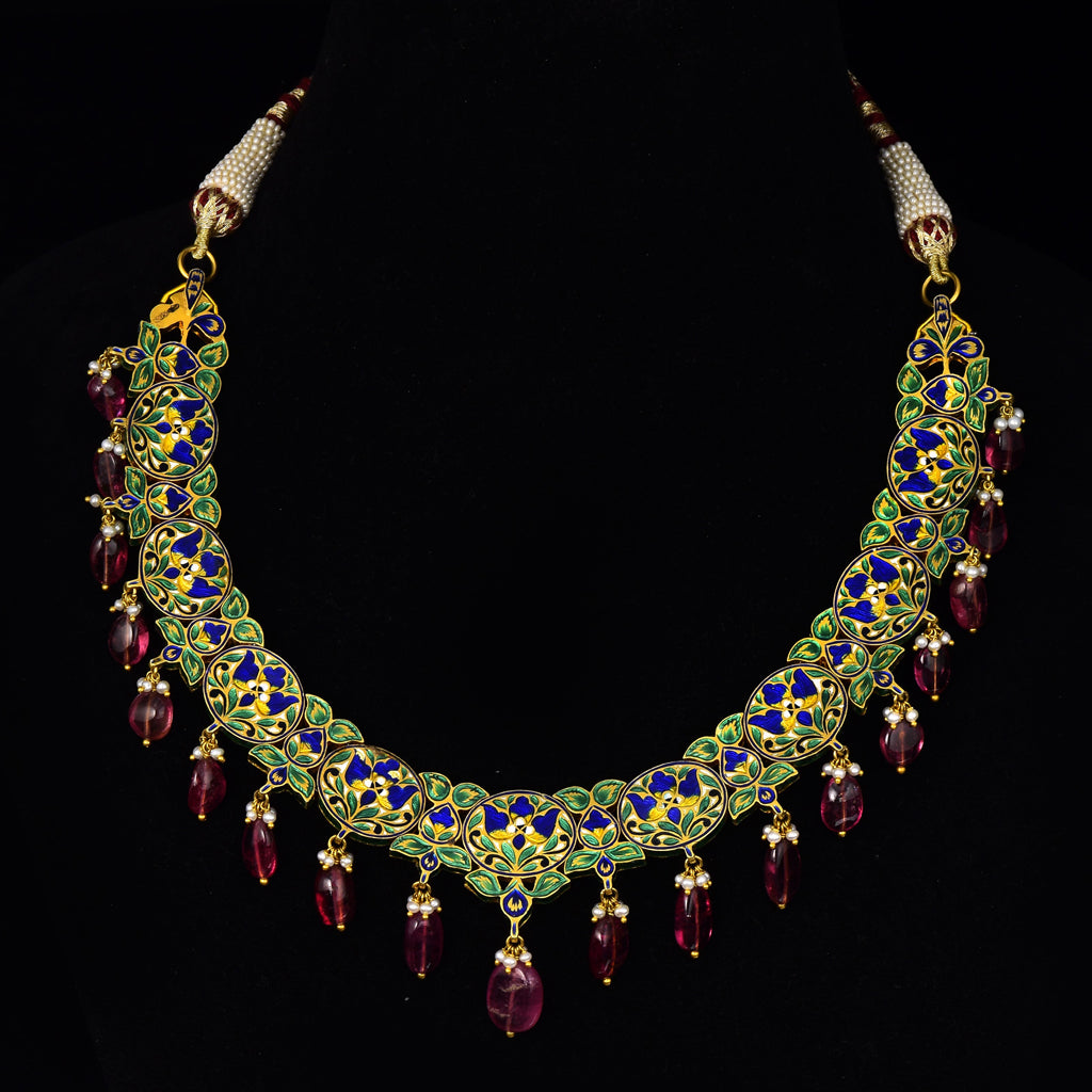 Beautiful Handcrafted jewellery made in Gold with Natural uncut diamonds & decorated with beautiful handwork enamel done inside the jewellery. Crafted by Suranas, pioneers of the handmade Kundan Meena & Polki jewellery iconic of the state of Rajasthan, India.