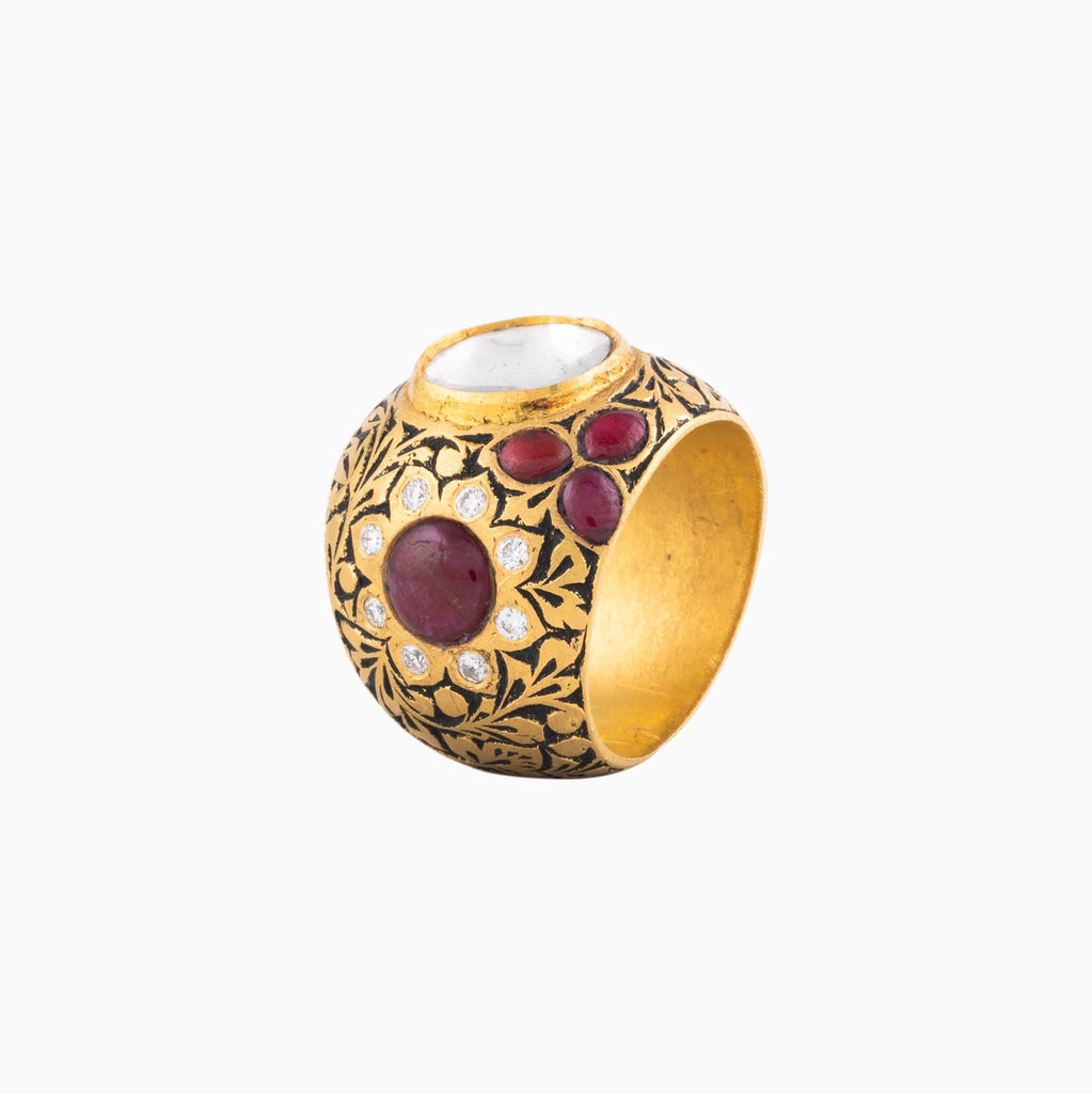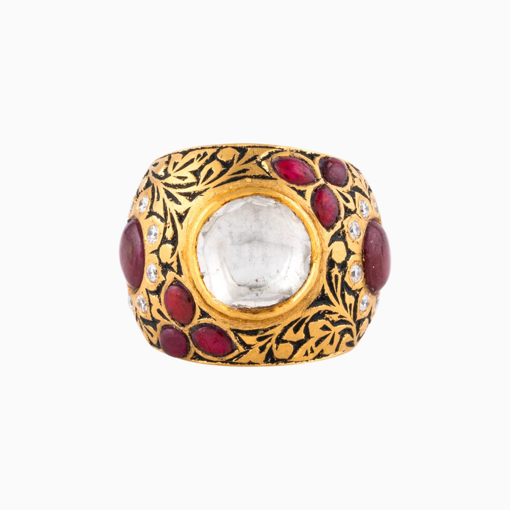 Ring with Partaz Work with Polki Diamond, Round Cut Diamond, Ruby-KMR0124